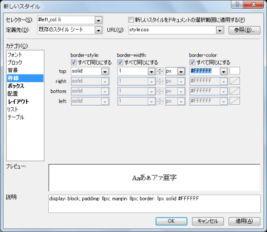 - 続いて、項目間の余白を設定するために、1ピクセルの白の実線を指定します。[枠線]カテゴリを開き、[border-style]を「solid」、[border-width]を1px、[border-color]の一覧から白(#FFFFFF)を選択します。