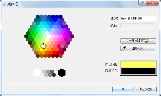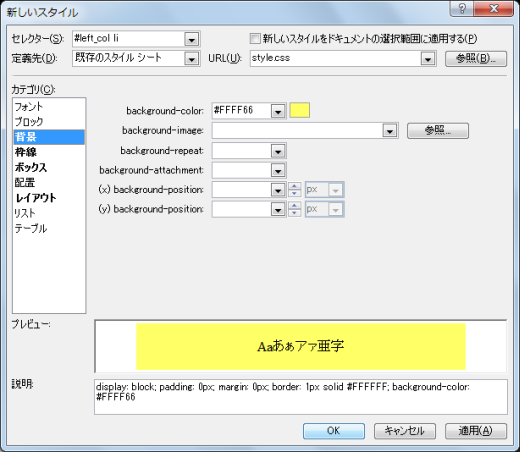 - 最後に、項目の背景色を指定します。[背景]カテゴリを開き、[background-color]プロパティにて背景色を指定するためにその横の升目ボックスをクリックし、[その他の色]から背景色を指定して[OK]ボタンをクリックします。[その他の色]から#FFFF66の色を選択
