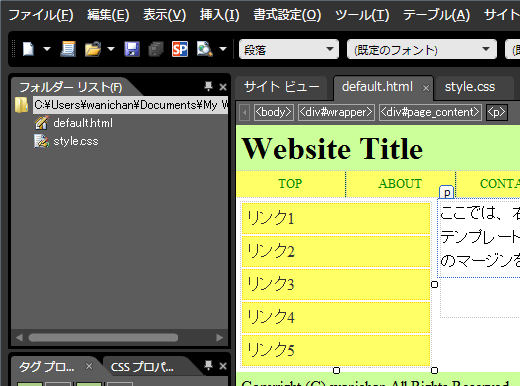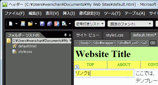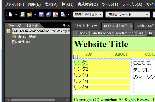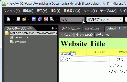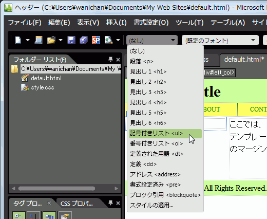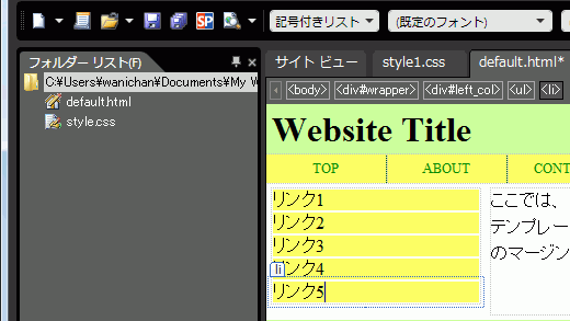 サイドバーのリストリンクのスタイルが設定できたら、実際にリストリンクを作ってみましょう。今回はツールバーの[スタイル]ボックスから[記号つきリスト]を選択してみましょう。ハイパーリンク先が未作成の場合は、ダミーの「javascript:;」にします。