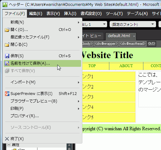前セクションで作成した「default.html」を基に、ダイナミックWebテンプレートを作成するには、まず、そのファイルをダイナミックWebテンプレートに変換して保存する必要があります。