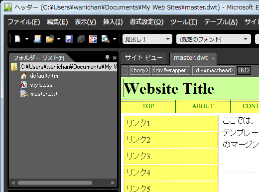編集可能な領域の設定をするには、そのファイルがダイナミックWebテンプレート(拡張子.dwt)である必要があるので注意してください。