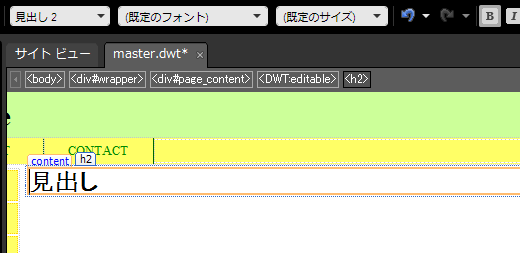 Webページによって可変するコンテンツ部分を編集可能な領域に設定するには、その中にひとつの見出しもしくは段落を入れる必要があります。