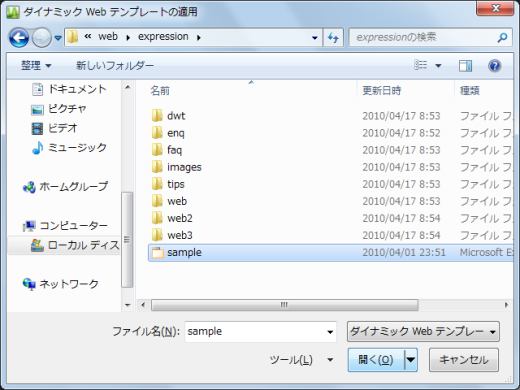 - 適用したいダイナミックWebテンプレートファイルを選択して[開く]ボタンをクリックします。