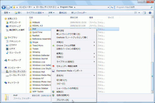 - Program Filesフォルダ内の「PHP」フォルダを右クリックして[プロパティ]を選択します。