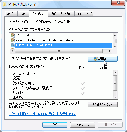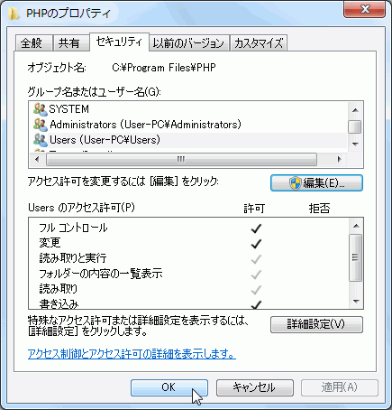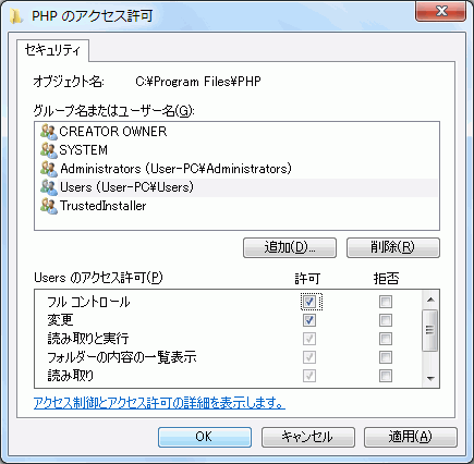 PHPをインストールしたら、ユーザーアカウントに対するインストールフォルダ自体のアクセス権をフルコントロールにします。