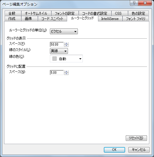 - [ページ編集オプション]の[ルーラーとグリッド]タブが開かれたら、[ルーラーとグリッドの単位]ボックスを指定します。既定では「ピクセル」ですが、「インチ」「センチメートル」または「ポイント」に単位を変更して[OK]ボタンをクリックします。