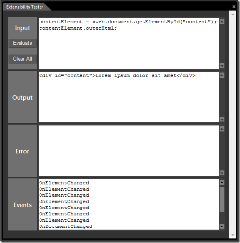 一度 Extensibility Testerアドインをインストールすると、[ツール]-[Extensibility Tester]に表示されます。InputボックスにJavaScript Expressionを入力して、[Evaluate]をクリックします。その出力やエラーメッセージの結果が出力およびエラーボックスにそれぞれ表示されます。Extensibility イベントは それらがクビになったようにEvents ボックスにトップの最近のイベントとともに書き込まれます。[Clear All]ボタンはもしすべてクリアにしたい場合に、すべてのテキストボックスをクリアできます。