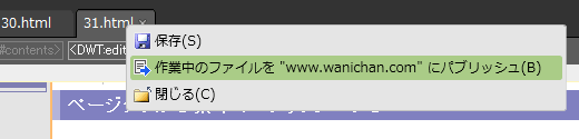 Expression Web 4から作業中のファイルを手軽に更新できるようになりました。メニューコマンドもしくはページタブからの右クリックで[作業中のファイルを"○○"にパブリッシュ]コマンドを実行することで、パブリッシュ先の適切なディレクトリにアップロードできます。