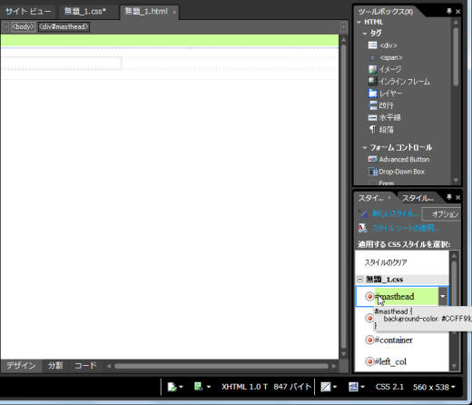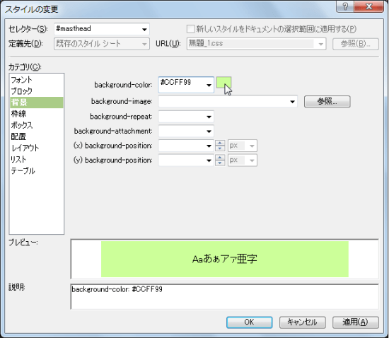 - [スタイルの適用]パネルの[適用するCSSスタイルを選択]の一覧から「#masthead」を右クリックして[スタイルの変更]をクリックします。