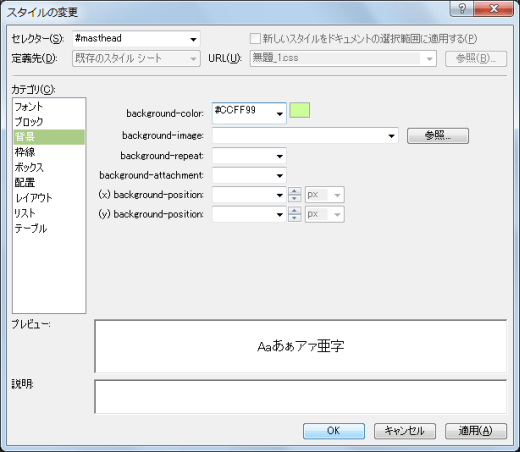 それぞれの背景色を指定するには、[スタイルの適用]パネルから変更したいCSSスタイルを右クリックしてスタイルを変更します。なお、背景色の指定は background-color プロパティを利用します。