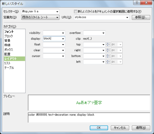 - [display]ボックスの▼をクリックして、一覧から[block]を選択します。この設定でリストのテキストだけではなく、リスト項目全体がリンクの範囲になります。