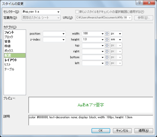 - [width]ボックスに任意の値を入力します。ここではそれぞれのリスト項目の幅と同じ幅に設定するので 100px 、高さを1.3emと指定します。