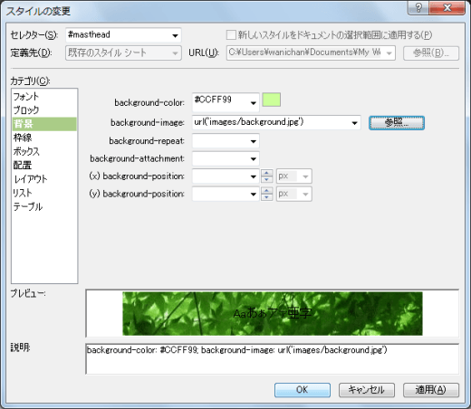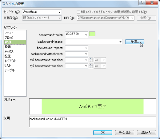 - 背景画像を指定するには[background-image]プロパティの[参照]ボタンをクリックします。