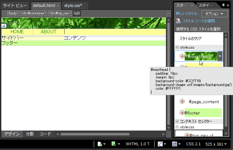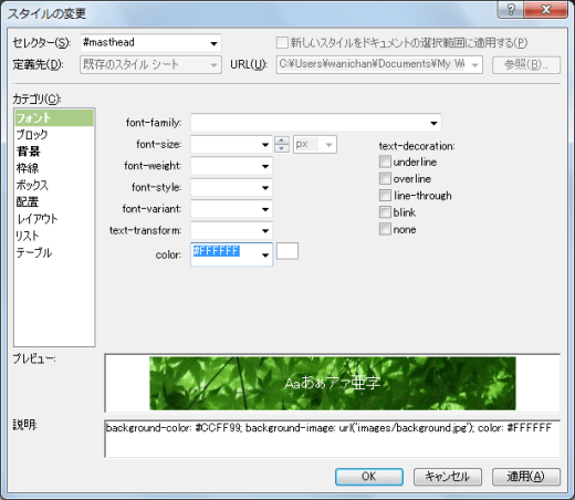 - [スタイルの適用]パネルから「#masthead]を右クリックしてショートカットメニューより[スタイルの変更]をクリックします。