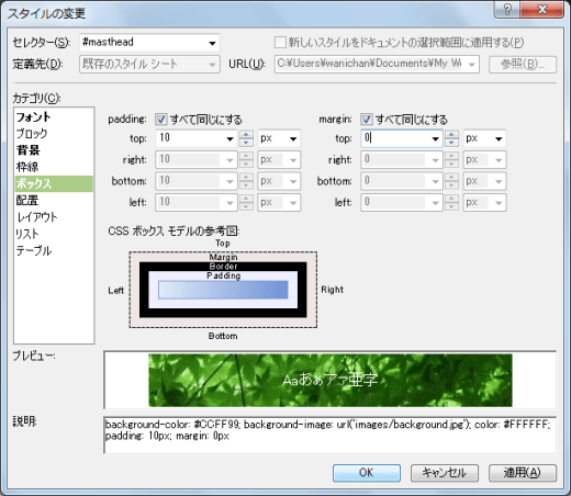 - [padding]を10ピクセル、[margin]では0pxにして[OK]ボタンをクリックします。