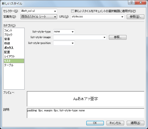 - [カテゴリ]ボックスから[リスト]を選択し、[list-style-type]プロパティを「none」に指定して、[OK]ボタンをクリックします。