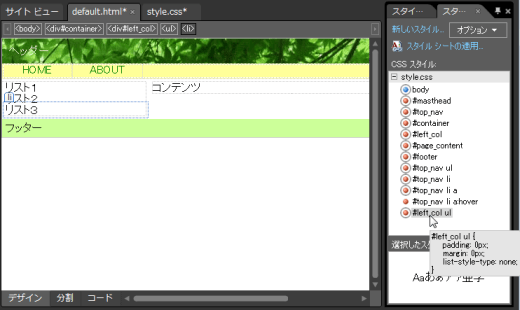 - [スタイルの管理]パネルを開くと、#left_col ul スタイルが生成され、マウスでポイントするとそのコードの内容がポップアップ表示されます。