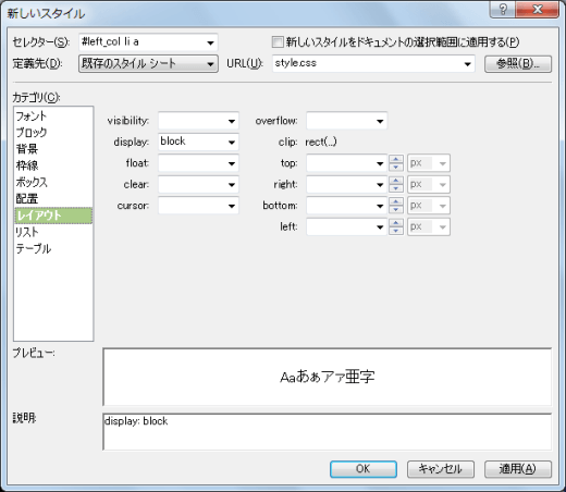 - [定義先]は「既存のスタイルシート」、URLは「style.css」が選択されていることを確認します。