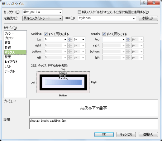 - [padding]の[すべて同じにする]のチェックはつけたままにして、「5px」と指定します。
