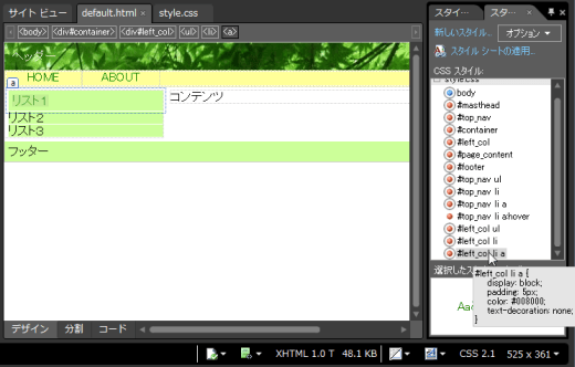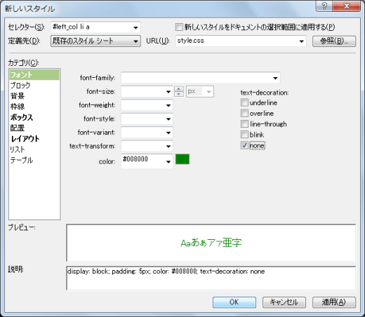 - [新しいスタイル]ダイアログボックスの[セレクター]ボックスには、「#left_col li a」と入力します。最初の「.」も消すことを忘れないように注意しましょう。