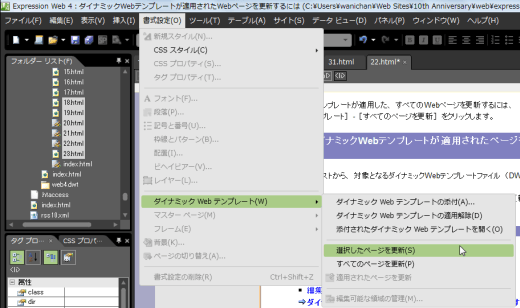 ダイナミックWebテンプレートファイル(DWTファイル)が適用されたWebページを最新の情報に更新する方法について説明します。