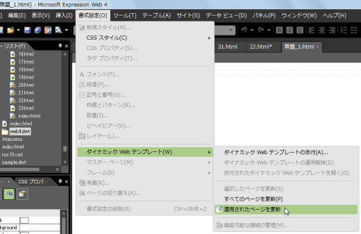 ダイナミックWebテンプレートが適用した、すべてのWebページを更新するには、[書式設定]-[ダイナミックWebテンプレート]-[すべてのページを更新]をクリックします。