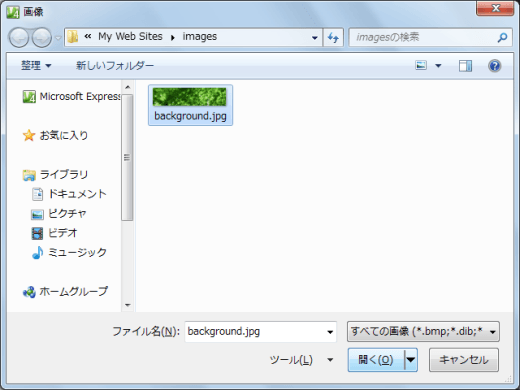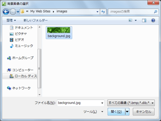 - [背景画像の選択]ダイアログボックスが表示されたら、画像ファイルを選択して[開く]ボタンをクリックします。