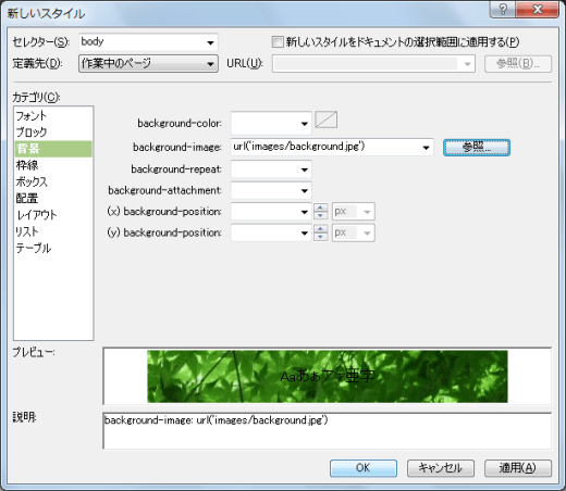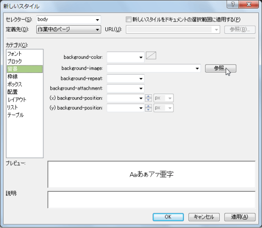- [background-image]ボックスの右側の[参照]ボタンをクリックします。