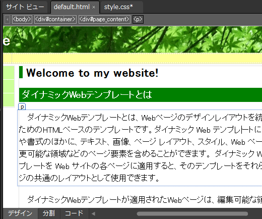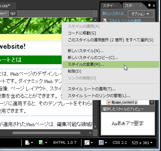 - 前の記事『行間を設定するには』で行間を設定している場合は、[スタイルの管理]パネルに切り替えて #page_content p を右クリックしてショートカットメニューより[スタイルの変更]をクリックします。(#page_content p が[スタイルの管理]パネル一覧に存在しない場合は[新しいスタイル]のリンクをクリックします。)
