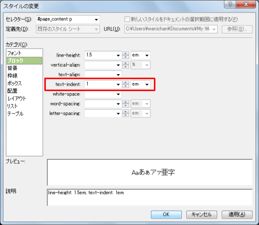 - 行頭を1文字下げるために、[text-indent]ボックスに「1」と入力し、その右側の▼をクリックして一覧から[em]を選択して[OK]ボタンをクリックします。