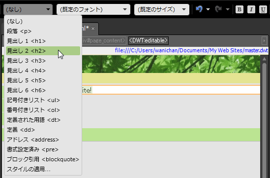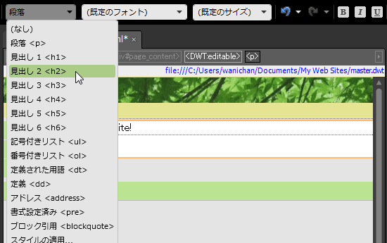 - [共通]ツールバーの[スタイル]ボックスの▼をクリックして、一覧から[見出し]を選択します。「見出し1」がサイトタイトルにすでに使われている場合、コンテンツエリアの最初の見出しは、その一つレベル下の「見出し2」を選択します。