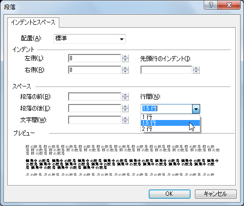 - [段落]ダイアログボックスの[行間]ボックスの▼をクリックして、一覧から行間の幅を選択します。なお、任意の値を直接入力することも可能です。
