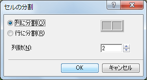 - [セルの分割]ダイアログボックスが表示されたら、分割方法を指定して[OK]ボタンをクリックします。