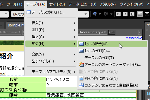 - [テーブル]メニューの[変更]をポイントして[セルの結合]をクリックします。