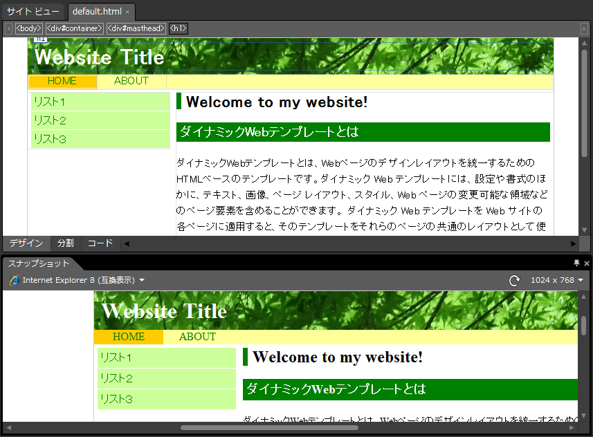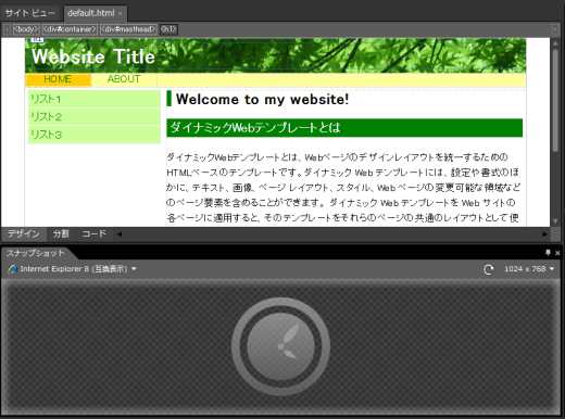 ブラウザーを起動せずにExpression Web内でページレイアウトのレンダリング(いかに表示されるか)を確認できる、スナップショットでページをプレビューするためのパネルを表示する方法について説明します。