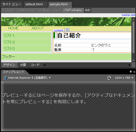 複数ページを編集中、他のページに切り替えると、下の図のように「プレビューするにはページを保存するか、[アクティブなドキュメントを常にプレビューする]を有効にします。」と表示されることがあります。