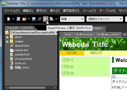 現在開いているWebページをExpression Web 4 SuperPreviewに表示する方法について説明します。