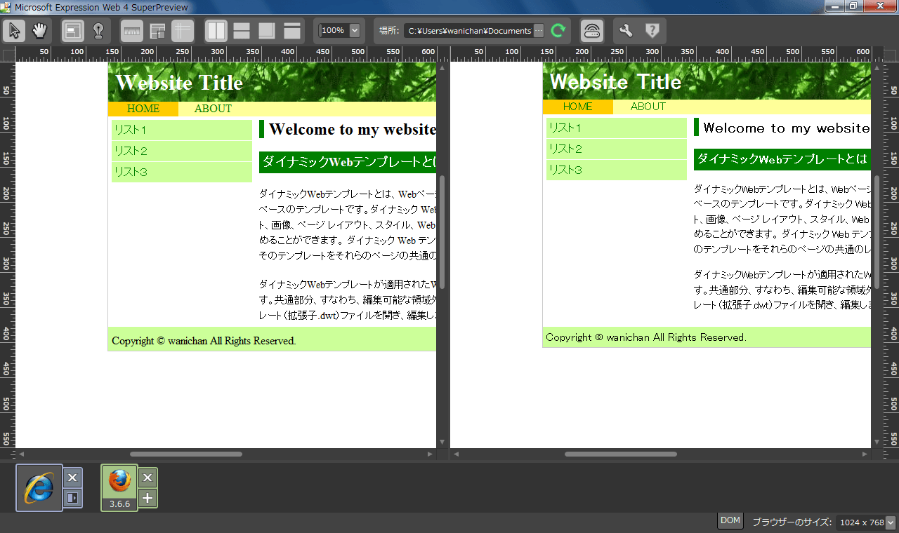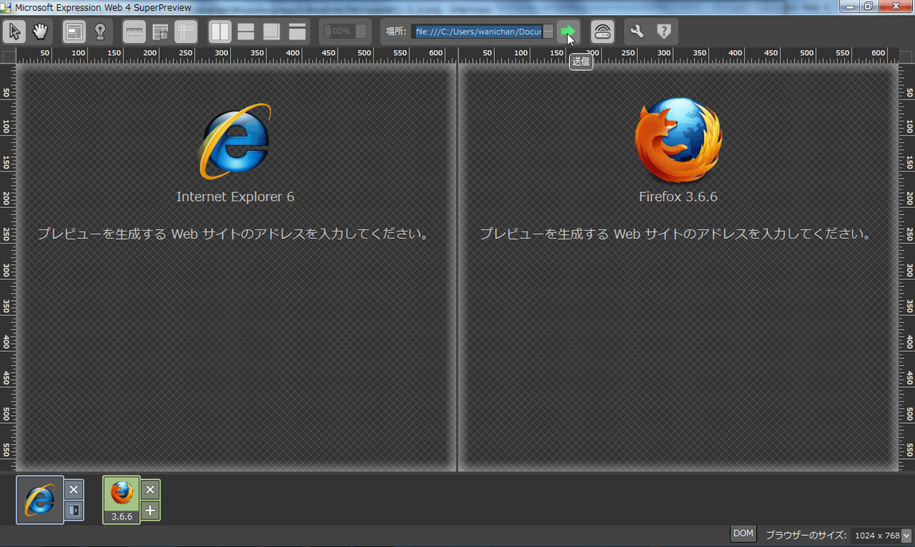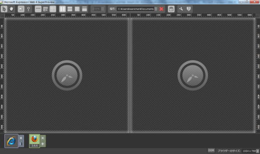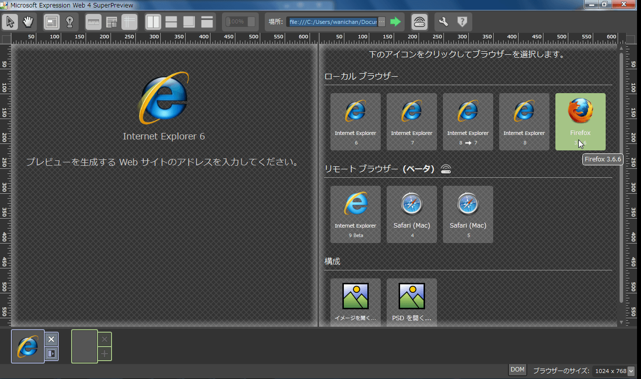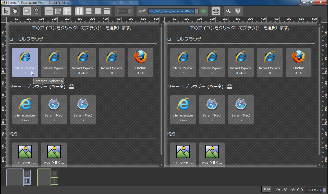 - SuperPreviewが起動したら、それぞれブラウザーを選択します。ここでは、左側にInternet Explorer 6、右側にはFirefoxを選択します。