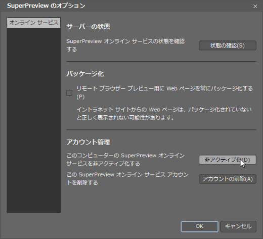 PCのトラブル等の要因により、今まで動作していたがオンラインサービスが利用できなくなった場合は、一度SuperPreview オンライン サービスを非アクティブ化してから再度アクティブ化を行ってみてください。