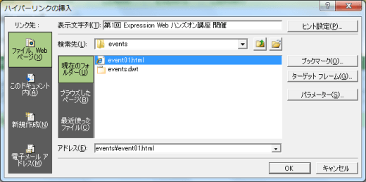 作業中のサイト内のWebページにリンクするには、ダイアログボックスを表示してWebページを指定します。フォルダーリストからリンク先のファイルをリンクを生成したい場所までドラッグ&ドロップするすると、そのページタイトルがリンクテキストとなります。