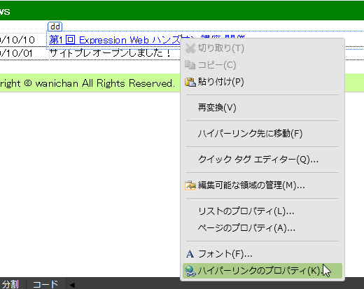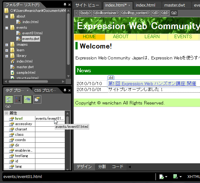 - 選択した部分にリンクが設定され、[タグ プロパティ]パネルのhref属性にリンク先のファイルが設定されました。