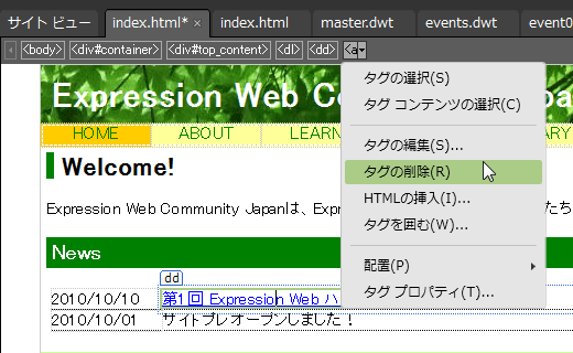 - クイックタグセレクターバーの[<a>]ボタンの▼をクリックして、[タグの削除]をクリックします。