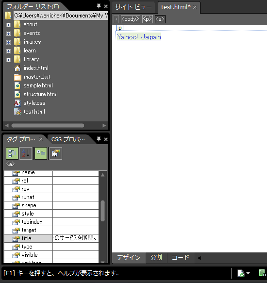 すでにハイパーリンクが設定された部分にヒントメッセージを設定するには、そのリンク部分を選択して、[タグプロパティ]パネルの title 属性に文字を入力します。
