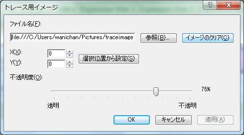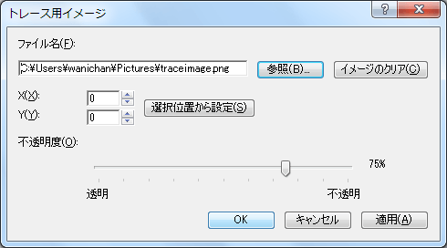 - XとYの値は、左上からの座標値を指定します。既定値では、左上0ピクセルからの絶対座標から挿入されます。Xは水平方向、Yは垂直方向の値です。もし、左上から右に10ピクセル、上から5ピクセルに設定する場合は、Xに「10」、Yに「20」を入力します。あらかじめレイヤーを挿入してその中にカーソルを移動しておき、[選択位置から設定]ボタンを押下することでその座標が自動的にXとYの値に代入されます。また、[不透明度]のスライダーを左方向にドラッグすることでトレース用イメージが透明になります。