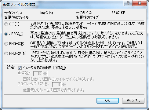 - [画像ファイルの種類]ダイアログボックスにて、変更したいファイル形式を選択して[OK]ボタンをクリックします。