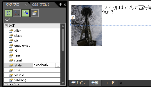 - [タグプロパティ]パネルの[属性]一覧から style を検索します。