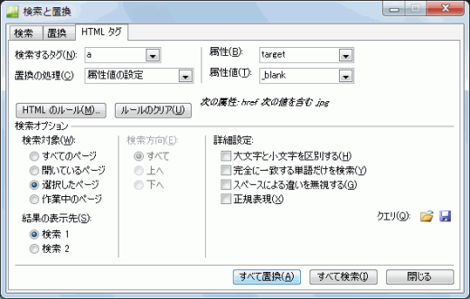 そこで、その画像を新しいウィンドウで開いて、そこに表示するには、<img>タグを囲んでいる<a>タグに新しいウィンドウで開くように属性値を設定します。検索と置換機能を利用することで、効率的に設定が行えます。