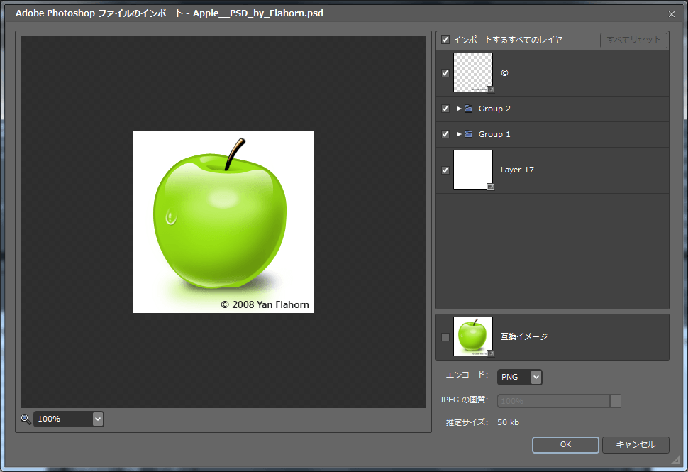 - [Adobe Photoshop ファイルのインポート]ダイアログ ボックスで必要なオプションを設定し、[OK]ボタンをクリックします。