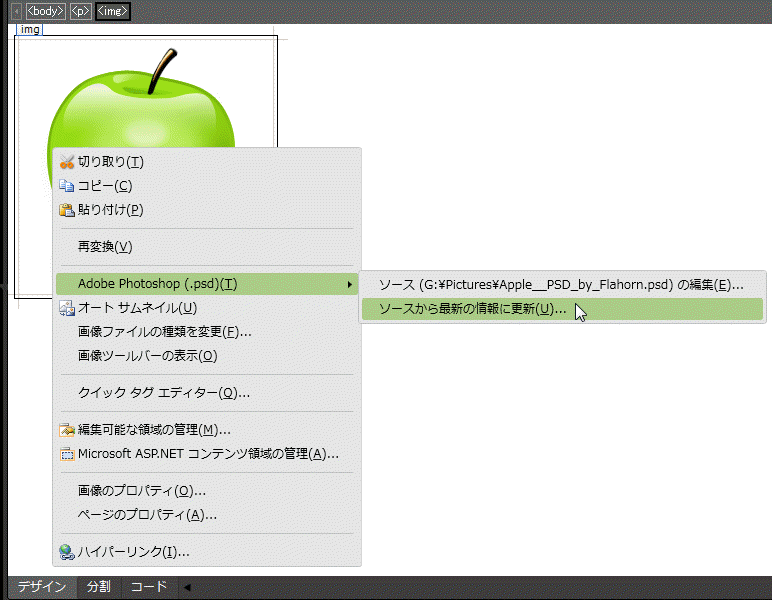 - デザインビューでその画像を右クリックして、ショートカットメニューより、[Adobe Photoshop (.psd)] をポイントして、[ソースから最新の情報に更新] をクリックします。