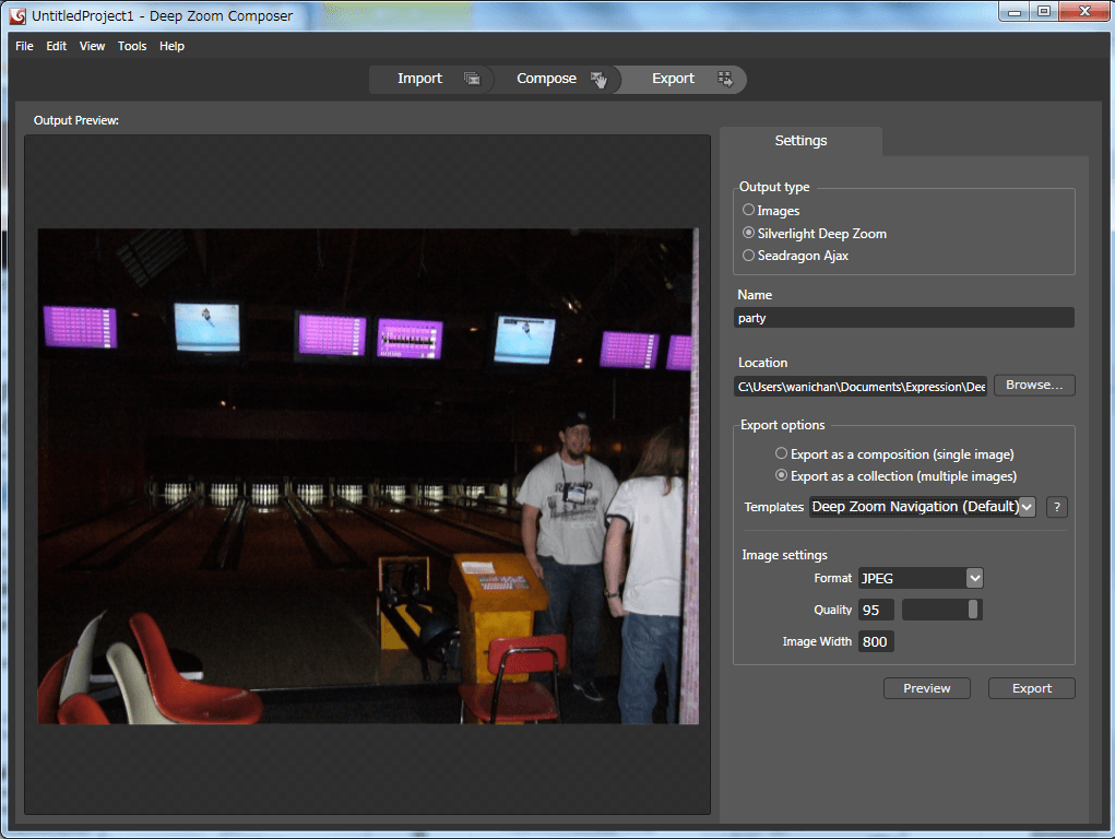 - [Settings]パネルの[Output type]設定オプションでは[Silverlight Deep Zoom]が選択されていることを確認します。